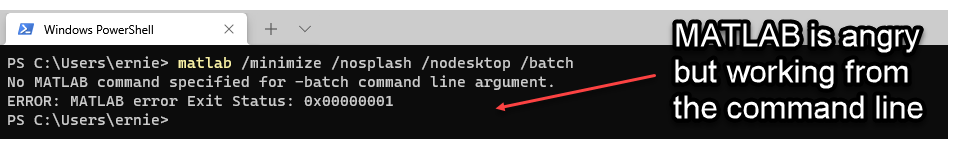 MATLAB must work from the command line for Make to activate and run your script! Let’s test our MATLAB command in a terminal window (should work on Mac, Windows, or Linux). In this case, I am going to open Windows terminal and run the command matlab -nogui -nosplash -batch . If matlab is available, Windows will complain that the nogui option is invalid (this is for Linux and Mac) but essentially tell you that it needs a script to run. Troubleshooting instructions here.